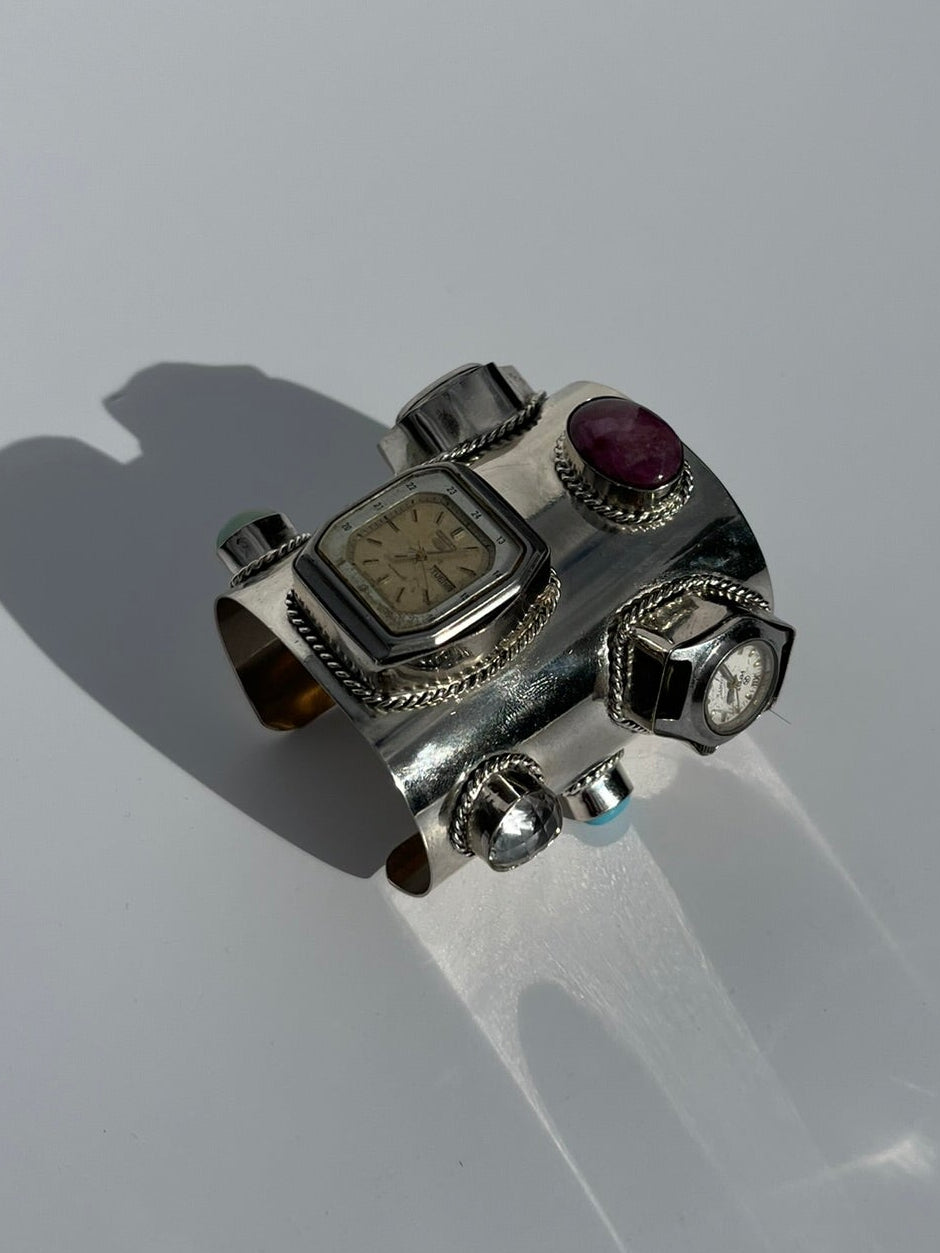 Each "Time Collector" is hand-built from salvaged vintage watches, uneven, imperfect, but alive.